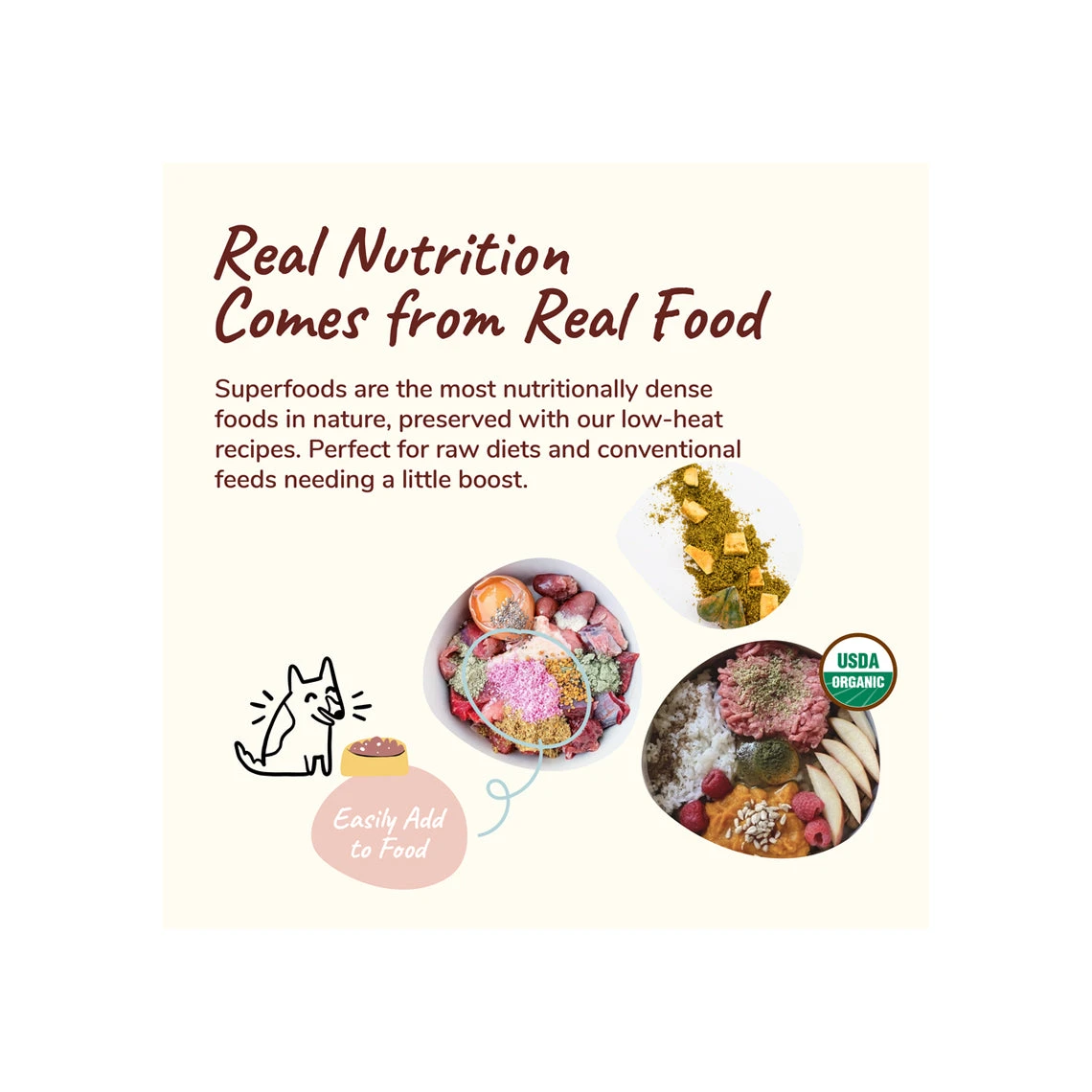 Real superfood supplements are a great way to administer health boosting ingredients to your dogs meal. They taste great, are derived from REAL ingredients and there are no grains. Each ingredient in this formula was veterinarian chosen and tested to ensure safety and efficacy.Â