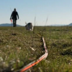 The 120 cm leash has a wrist loop, a carabiner and a D-ring.