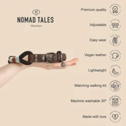 The strap of the Nomad Tales Spirit collar, pine is made of vergan leather, which not only looks classy, but also ensures a clear conscience for animal lovers. The devoted design with its relaxed and cheerful colour scheme is completed by the chic Nomad Tales trailer. Add the matching leash if you like!