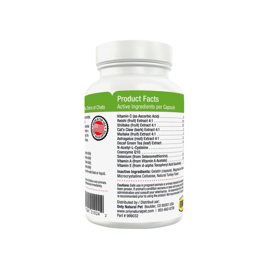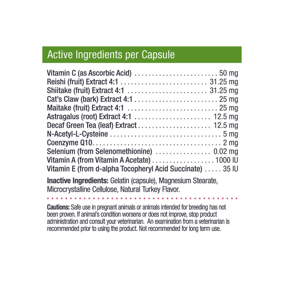 Only Natural Pet Immune Strengthener Support Supplement for Dogs & Cats is a mushroom, herb, vitamin, and compound powder blend in an easy-to-administer capsule with a natural turkey flavor. Active ingredients include reishi, shiitake, and maitake mushrooms, cat’s claw, astragalus, green tea, coq10, and more, to help support your pet’s overall health and wellness.