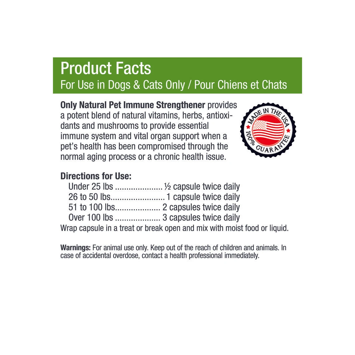 Only Natural Pet Immune Strengthener Support Supplement for Dogs & Cats provides a potent blend of natural vitamins, herbs, antioxidants, and mushrooms to help support essential immune health in pets and help maintain organ health for your pet. Veterinarian formulated, this powder-filled capsule is designed to help support your adult and senior dog or cat.