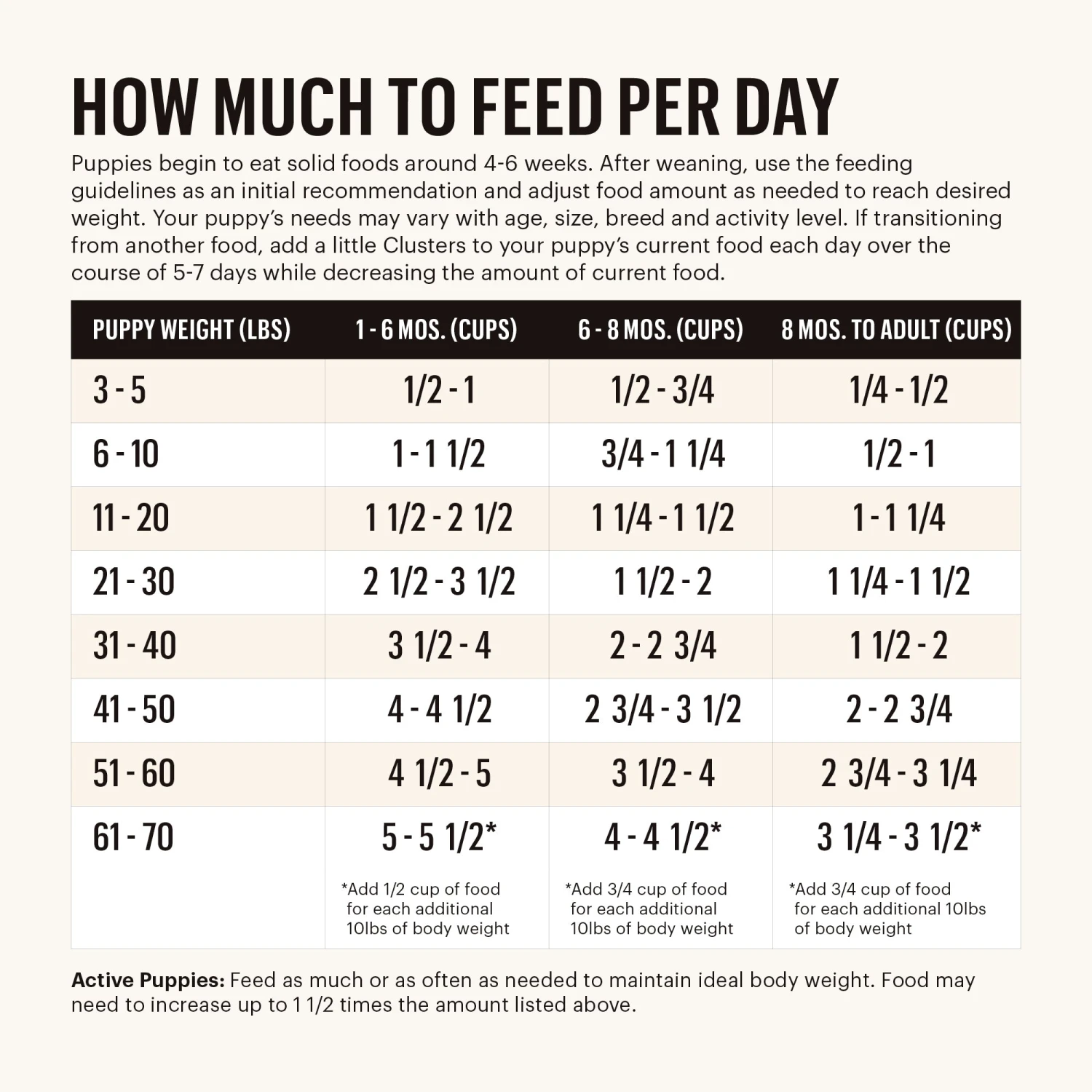 The Honest Kitchen Whole Grain Free Clusters Puppy Dog Food is human grade dry dog food for puppies! This recipe contains that freshest, cleanest ingredients with minimal processing. This product will provide puppies with the best nutrition possible. It is created by a veterinary nutritionist, these 100% human grade clusters are made with cage free chicken (no rendered meals!), veggies, salmon oil, and probiotics in proportions just right for growing puppies. Ingredients are roasted and dehydrated so that each bite is the perfect size for smaller puppy mouths. Every batch is made in a human grade facility with lots of love and without compromise. *Substantiated by In-Home AAFCO Feeding Trial